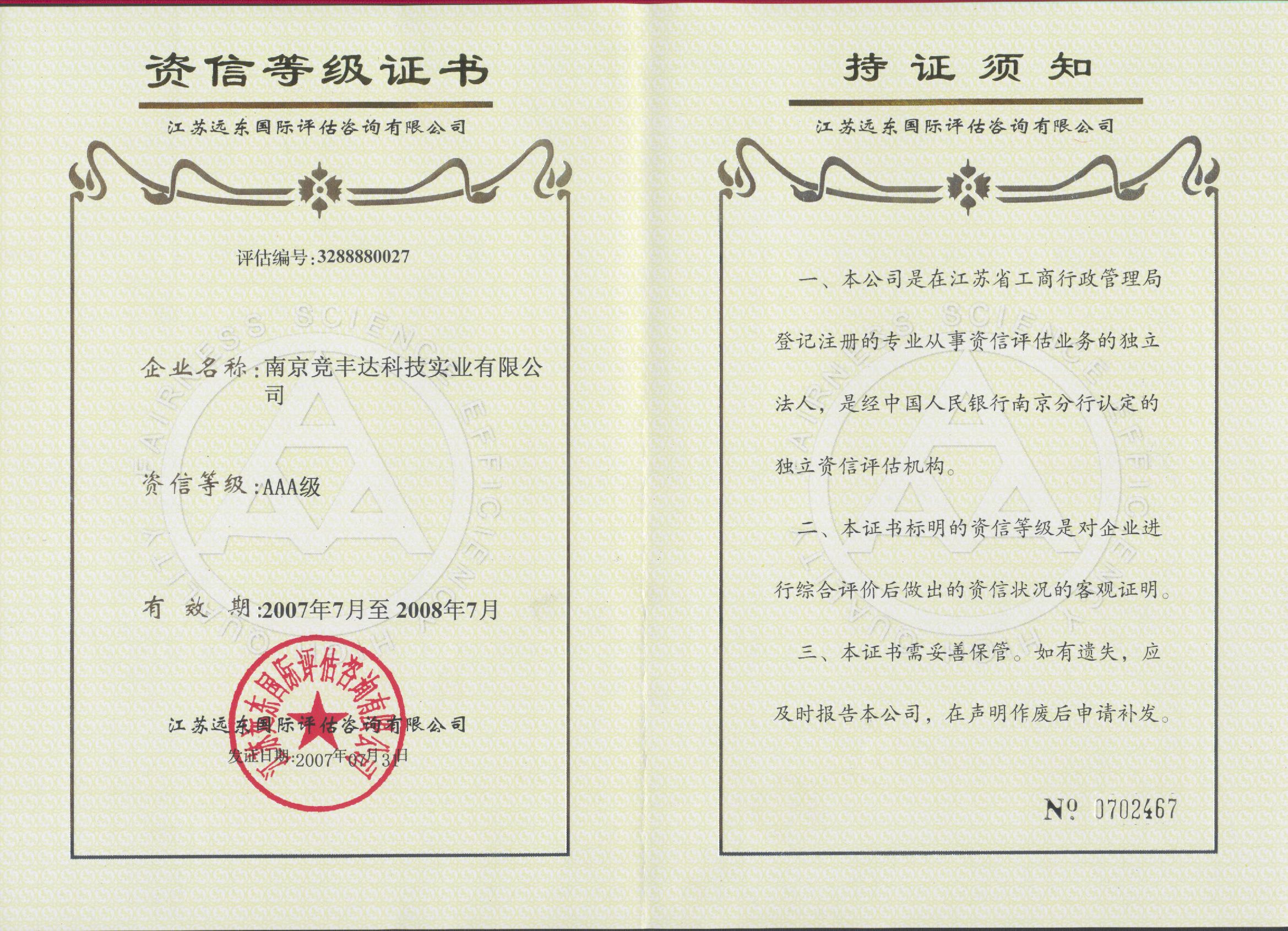 近日,经过中国人民银行授权的权威资信评估机构——江苏远东国际评估咨询有限公司的评审,我公司又一次获得AAA级资信等级证书。