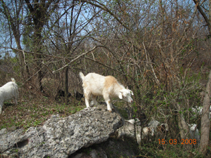 你看他的得意地样子 以为自己是众人瞩目的明星呢!看完动物朋友们,我们来到了胭脂峡,听说有小三峡之称哦!那就让我们感受一下它的秀美吧!我们的队伍被各地方的旅行团分成了若干队,下面已有几艘船停岸待舶,挤了一个多小时,我们终于被挤了下来,真是不容易啊!我们上了一个很古典的木制小船,船夫让我们穿上橘色救生衣,衬托着我们的游船更像一只顽皮戏水的蛟龙,胭脂河之所以成名,是因为两岸的土是红褐色的,别出一格,浪花轻拍岩石,我们游曳在峡谷间,美好的东西总是这么短暂,我们靠岸了。船夫把船稳稳的停靠在岸边,上岸后不远处有好多小山羊,有白色、黑色的,吸引了不少游客来给它们拍“写真”。这一路我们有拍又唠,不知不觉肚子在咕咕叫了,去吃山野菜吧,大家这样议论着。