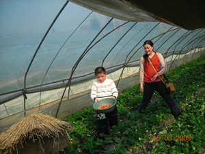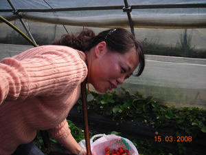 下午我们的行程是去傅家边农业生态园赏梅花、采草莓,一路上我们问了几个路人,最后确定了傅家边的具体位置,我们沿着小路,上了盘山道,迂回曲折的山路把我们带到了梅花飘香、草莓硕果遍地熟的魅力之园——傅家边,我们顺着梅花香,走入了梅花园。“你们看,远处是茶树”“茶树?没见过”……老刘总指给我们看,听他讲只有上面的茶树尖才能用来做茶叶。远处好多大棚,那就是种草莓的地方。我们拿着小盆,分头钻进了大棚。好热啊,像洗桑拿。绿油油的叶子里面夹杂着红彤彤的草莓。姐妹同心、其利断金,也不管什么淑女形象了,连吃带采,每个人都是踩的两脚泥巴,一头汗水,哈哈。
