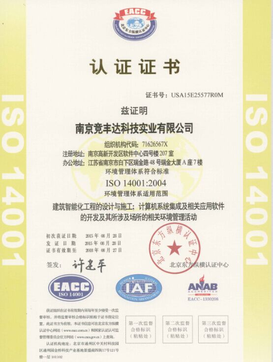 2015年8月,我司顺利通过了《ISO14001:2004》环境管理体系认证并获得证书,该证书的认证范围包含了建筑智能化的设计与施工,计算机系统集成及相关软件的开发与应用的相关场所的环境管理活动等。